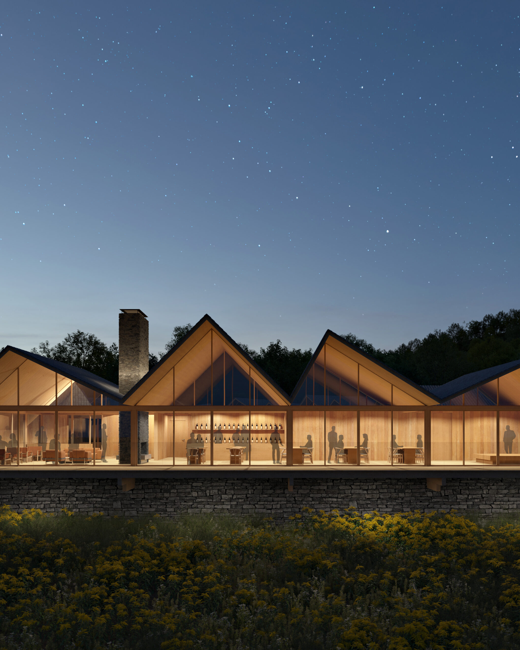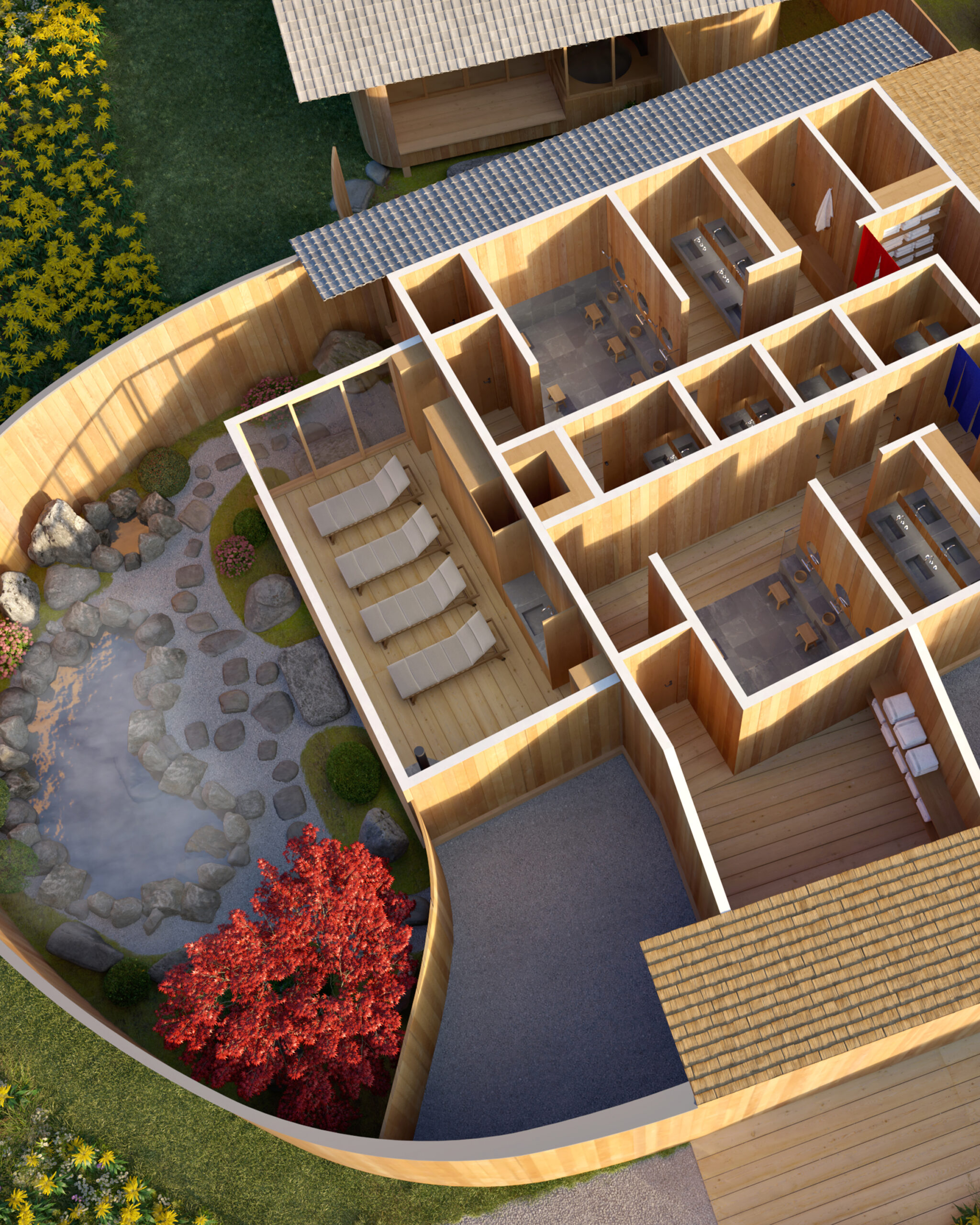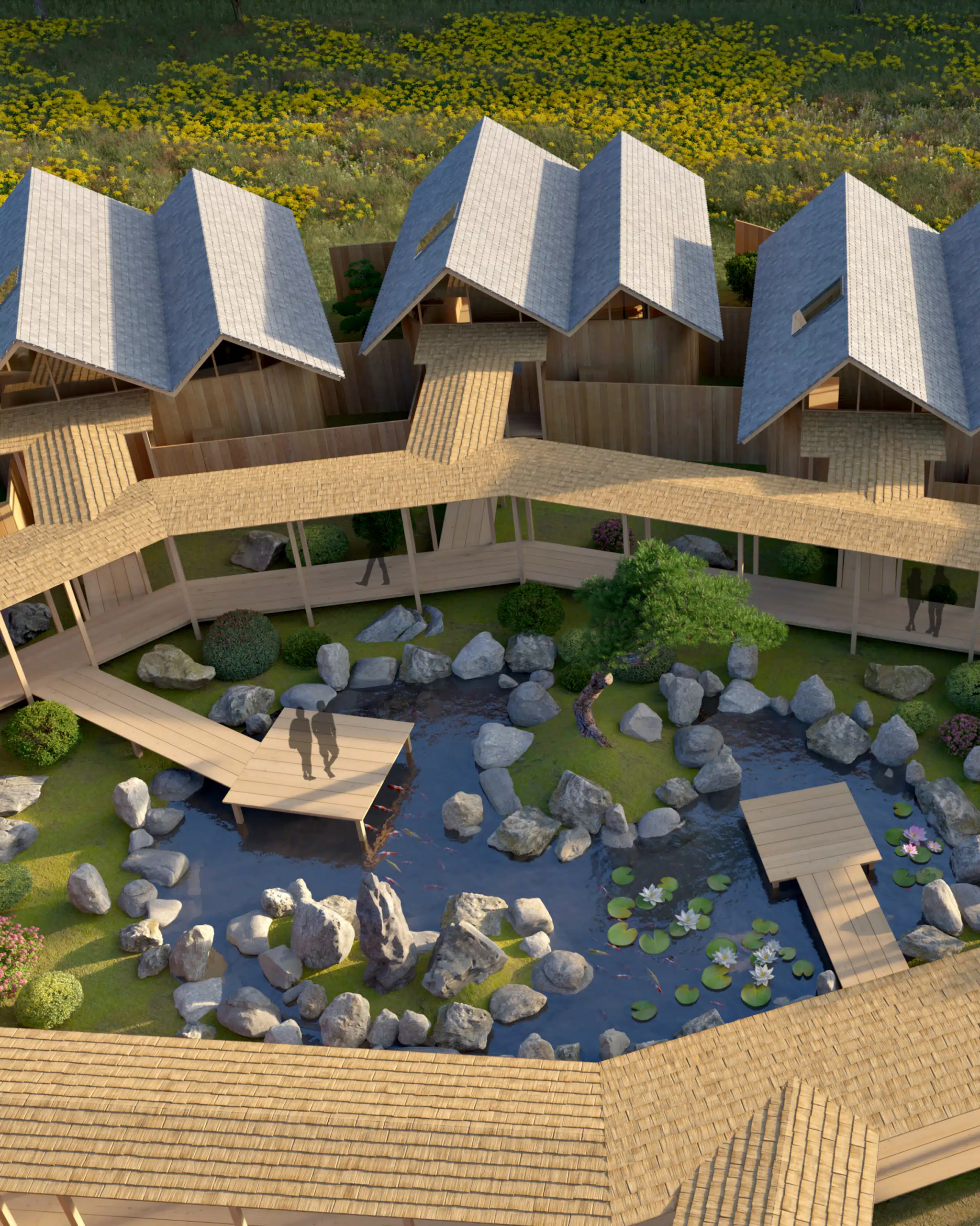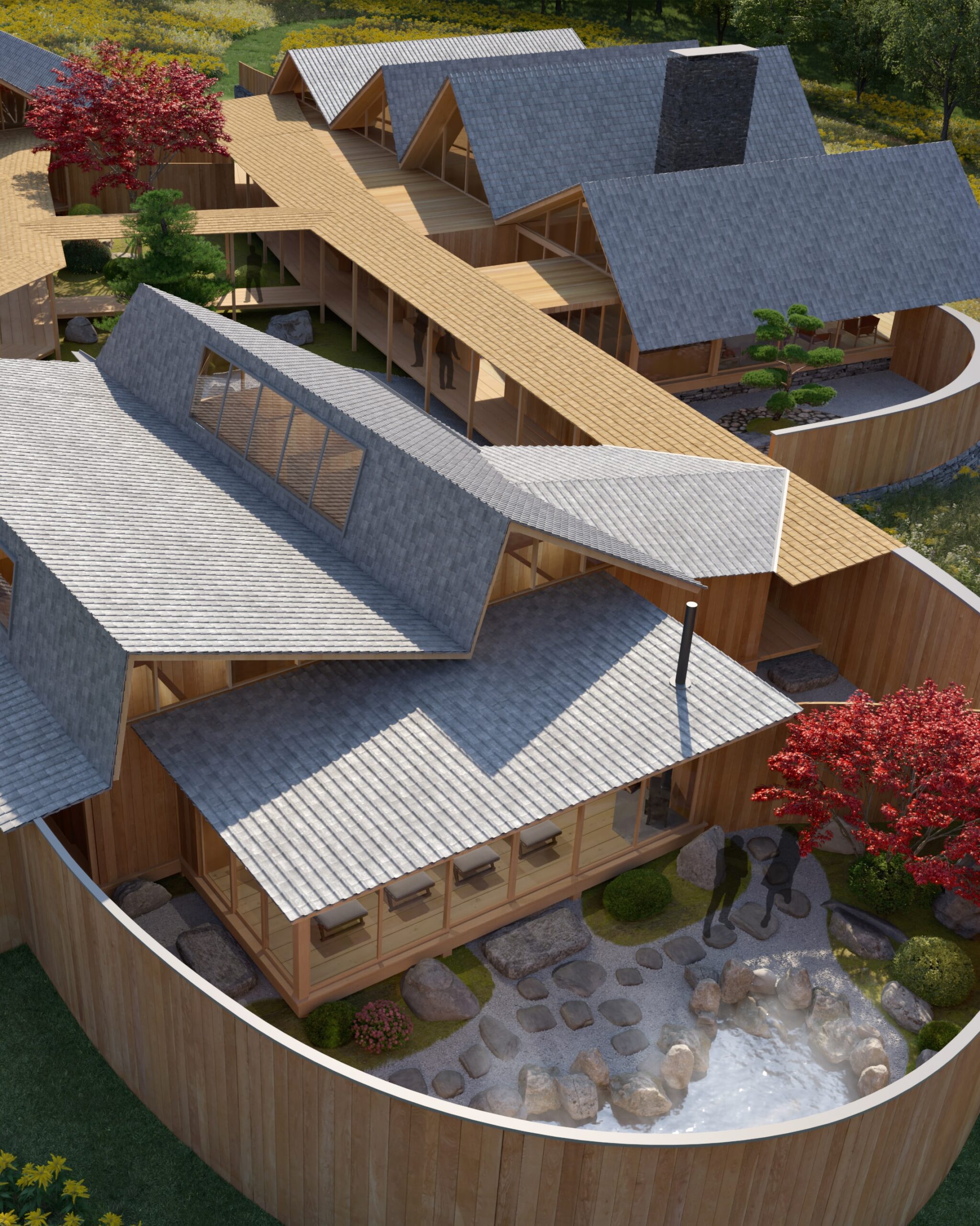 Drawing inspiration from Japanese aesthetics, the spread layout evokes the unfolding of a paper fan, while the asymmetrical roofs resemble folded paper. The inn is nestled amongst a filed of wildflowers and trees contributing to the inn’s distinctive ambiance.